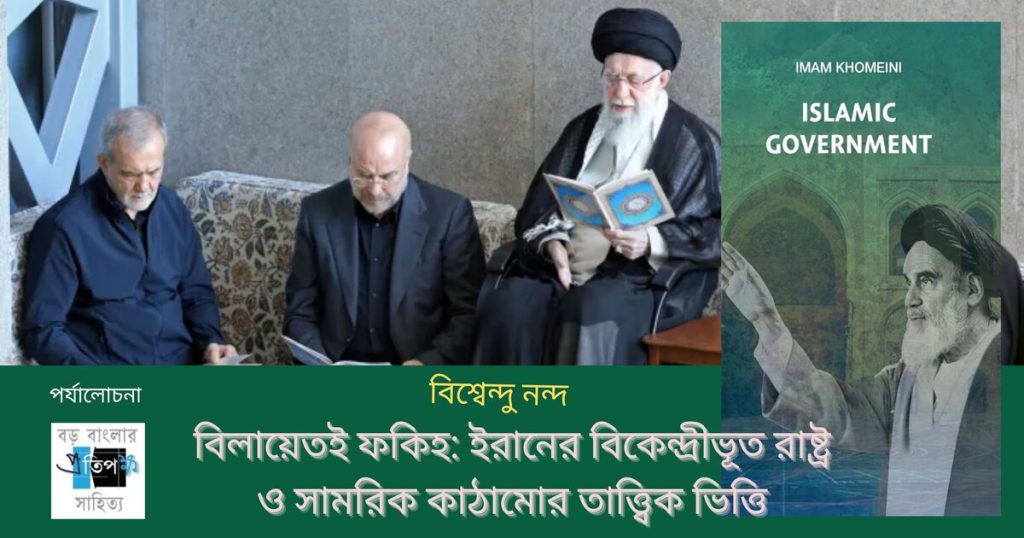 ইরানের ইসলামী প্রজাতন্ত্রের রাষ্ট্রকাঠামো বোঝার এই কাজে সহায়ক হয়েছে ইসলামি বিপ্লবের পরের আমলে বিকশিত বিলায়েতই ফকিহ (ولایت فقیه, Velayat-e Faqeeh) বা ইসলামী আইনবিদের শাসন তত্ত্ব। ১৯৭৯-এ ইসলামী বিপ্লবের পর এই তত্ত্বের ভিত্তিতে গড়ে ওঠা ইরানের রাষ্ট্রব্যবস্থা গত চার দশকে  অনন্য কাঠামো তৈরি করেছে – যেখানে আমরা  একই সাথে কেন্দ্রীভূত কর্তৃত্ব এবং বিকেন্দ্রীভূত কাজকর্মের সমন্বয় দেখি। ২০২৫-এর ১২ দিনের যুদ্ধ এবং আরও বড়ভাবে ২০২৬এর প্রত্যক্ষ সামরিক সংঘাতে ইরানের এক ঝাঁক শীর্ষ নেতৃত্ব শহিদ হওয়ার পরেও, তার রাষ্ট্র ও সামরিক কাঠামো টিকে থাকার যে বিরল ক্ষমতা দেখিয়েছে, আমি মনে করছি, তার মূল ব্যাখ্যা লুকিয়ে আছে এই বিলায়েতই ফকিহ তত্ত্বতে। এবং আরও বড় কথা হল, এই তত্ত্বকে ইরানী নেতৃত্ব সময় এবং অভিজ্ঞতার আলোয় বদলেছেন, নিজেদের রাষ্ট্র, সমর ক্ষমতাকে ঢেলে সাজিয়ে  বিশ্ব ইতিহাসে দুটি অন্যতম ক্ষমতাশালী সমরসজ্জার দেশ ইজরায়েল আর আমেরিকার মুখোমুখি হয়েছেন আপন বাহুবলেই এবং আপন সীমাবদ্ধতাকে কলন করেই।
